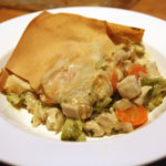 On most days, I would make my own crust for chicken pot pie — probably exactly like this cheddar pastry that I love for our regular chicken pot pies. But when I was shopping a few days earlier, I discovered a few different types of crusts, and I wanted to see if I found any of them acceptable for whipping up meals more quickly. I’m finding that I have less and less time to cook lately, or just less desire because I’m worn down from all the work I’m doing and chasing Mack around for an hour or so (she is like a whirlwind at the end of the day!). So I’ve broken from my norm of making everything from scratch. And yes, I have come to regret it. The crust I used on the bottom of this dish was definitely not appropriate (something Rewe Bio brand which I honestly would not use for anything) — and the top crust was a Tante Fanny Filo dough which would make killer spring rolls, but was not so great for pot pie.