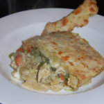 Since I had some crust left over, I made little thin biscuits to go along. Next time around, I might try to put a crust on the bottom of the dish also since I always like that more and feel a good pot pie needs a lot of crust. But it worked well to just crumble in some of the baked crust instead. I will also use a different veggie mix that includes carrots, peas and the like since ours wasn’t quite what I had in mind – but you have to improvise in foreign countries!