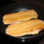 [wpurp-searchable-recipe]Pressed Hot Ham & Cheese Sandwiches – Serves 2 – mayonnaise, mustard, baguette (ends cut off, cuthalf and split lengthwise), thinly sliced deli turkey meat, thinly sliced cooked ham, thinly sliced Swiss cheese, , Spread mayo on the top half of baguettes and mustard on the bottom half. On each roll, arrange layers of turkey, ham, and cheese. Close sandwiches.; Heat a non-stick skillet over medium high heat. Place sandwiches in skillet. Cook sandwiches for 2 minutes, using a large pot weighted down with canned goods to press them. Flip, and cook for 2 more minutes, or until cheese is melted. Remove from heat, place on plates, and cut in half diagonally.; ; – – German – Featured – Food[/wpurp-searchable-recipe]
