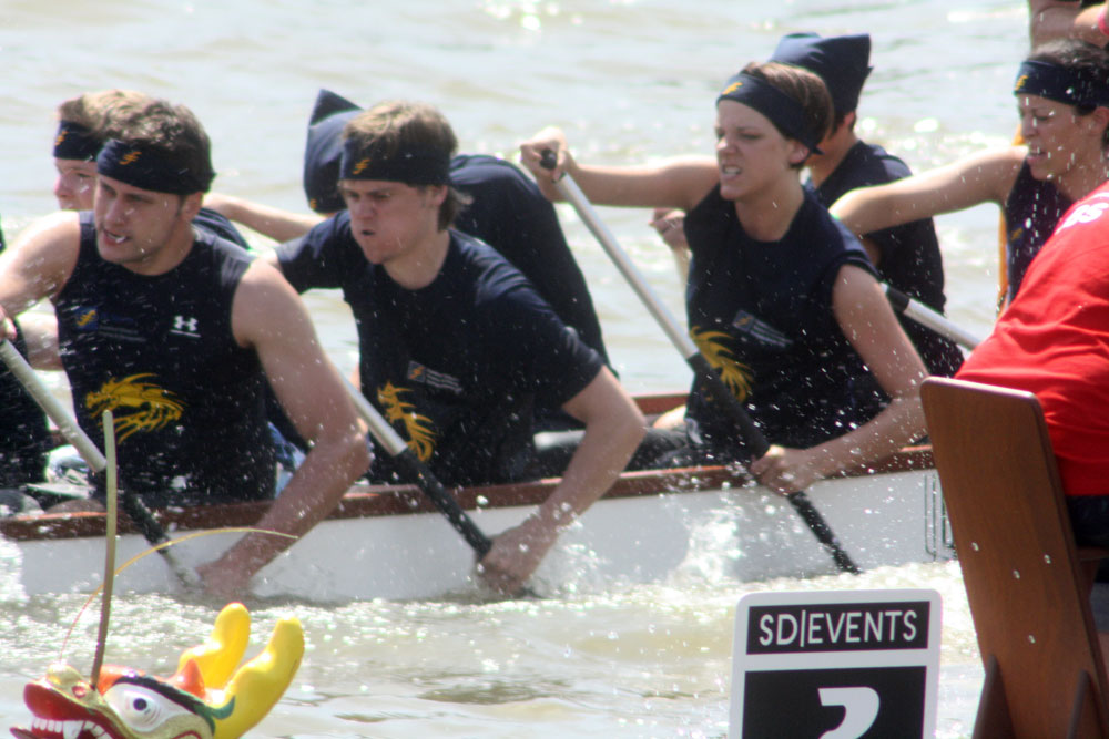 Twenty-two people power each dragonboat: 20 paddlers, 1 beating the drum and 1 steering the craft. The boats are decorated with a dragon head and tail.