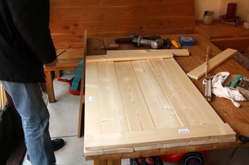 Once they’d gotten everything home, it was time to cut everything up with the table saw. And that’s when they realized that the boards which said “about 240cm long” on the sticker were actually 238cm long. SO they couldn’t actually get two 120cm pieces out of each as planned. They cut up what had already been purchased and assembled as many shutters as they could. Then made another run to the store for more wood on the following day. And the leftover pieces of wood will become shutters for the guest house windows so the lovely yellow insulation no longer is apparent (which I’ve become so used to see that I don’t even notice anymore…)